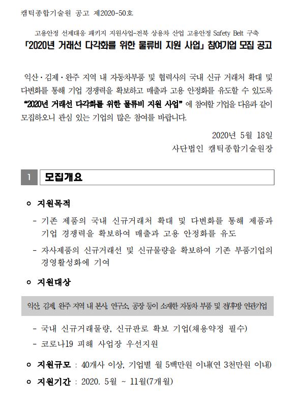 (캠틱종합기술원)2020년 거래선 다각화를 위한 물류비 지원 사업 참여기업 모집 공고