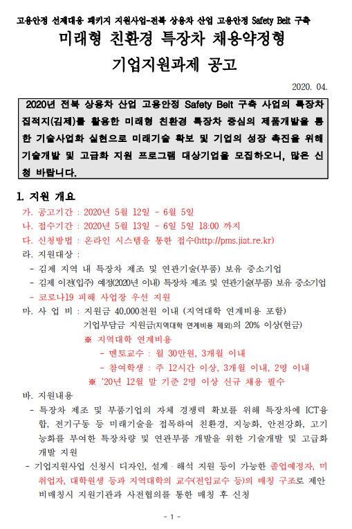 (자동차융합기술원) 미래형 친환경 특장차 채용약정형 기업지원과제 공고