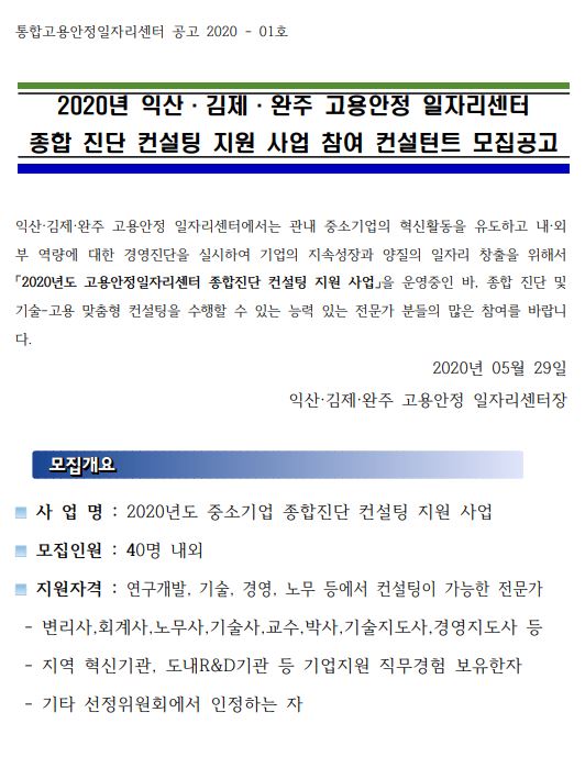 2020년 김제 고용안정 일자리센터 종합진단 컨설팅 지원사업 참여기업 모집 공고