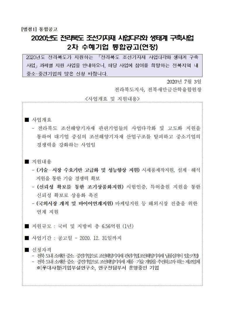 2020년_전라북도_조선기자재_사업다각화_생태계_구축사업_2차_수혜기업_연장_통합공고(공고문).hwp