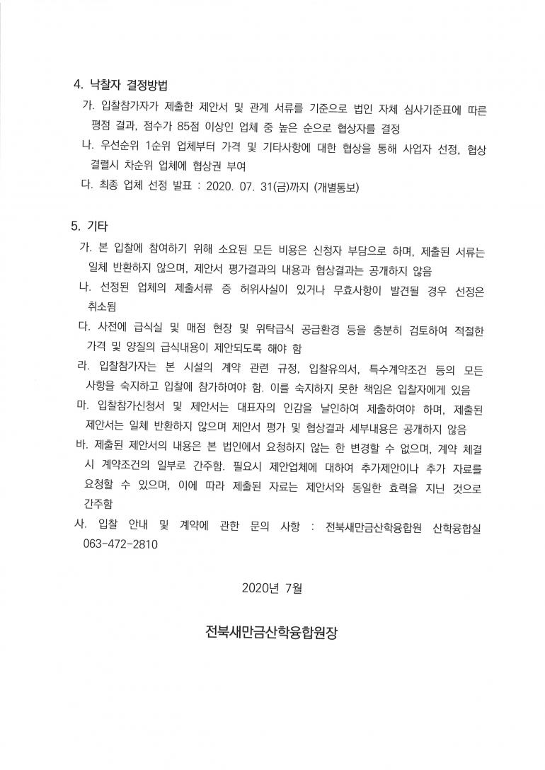 전북새만금산학융합지구 식당 급식 위탁 및 매점운영업체 선정 공고