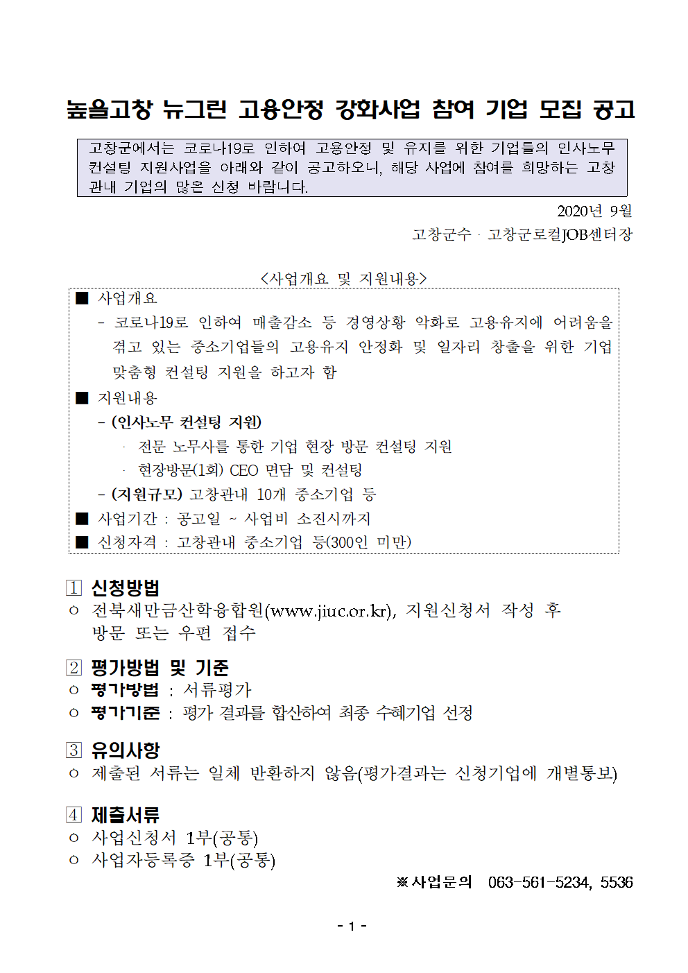 코로나19 극복을 위한 높을고창 뉴그린 고용안정 강화사업 참여기업 모집(종료)