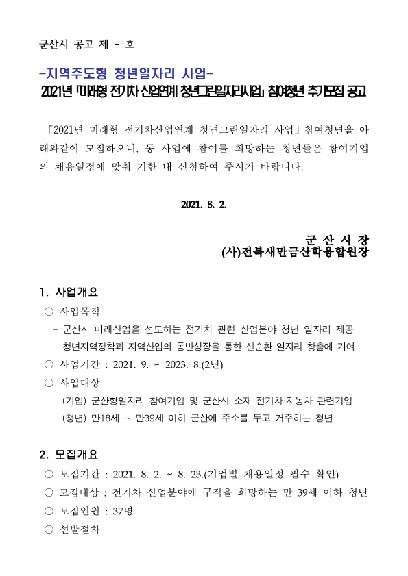 2021년「미래형 전기차 산업연계 청년그린일자리사업」 참여청년 8월 추가모집 공고