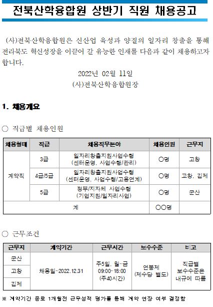 전북산학융합원 상반기 직원 채용공고