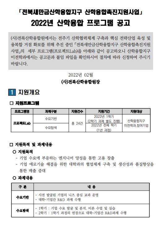 2022년 산학융합 프로그램(프로젝트Lab) 공고