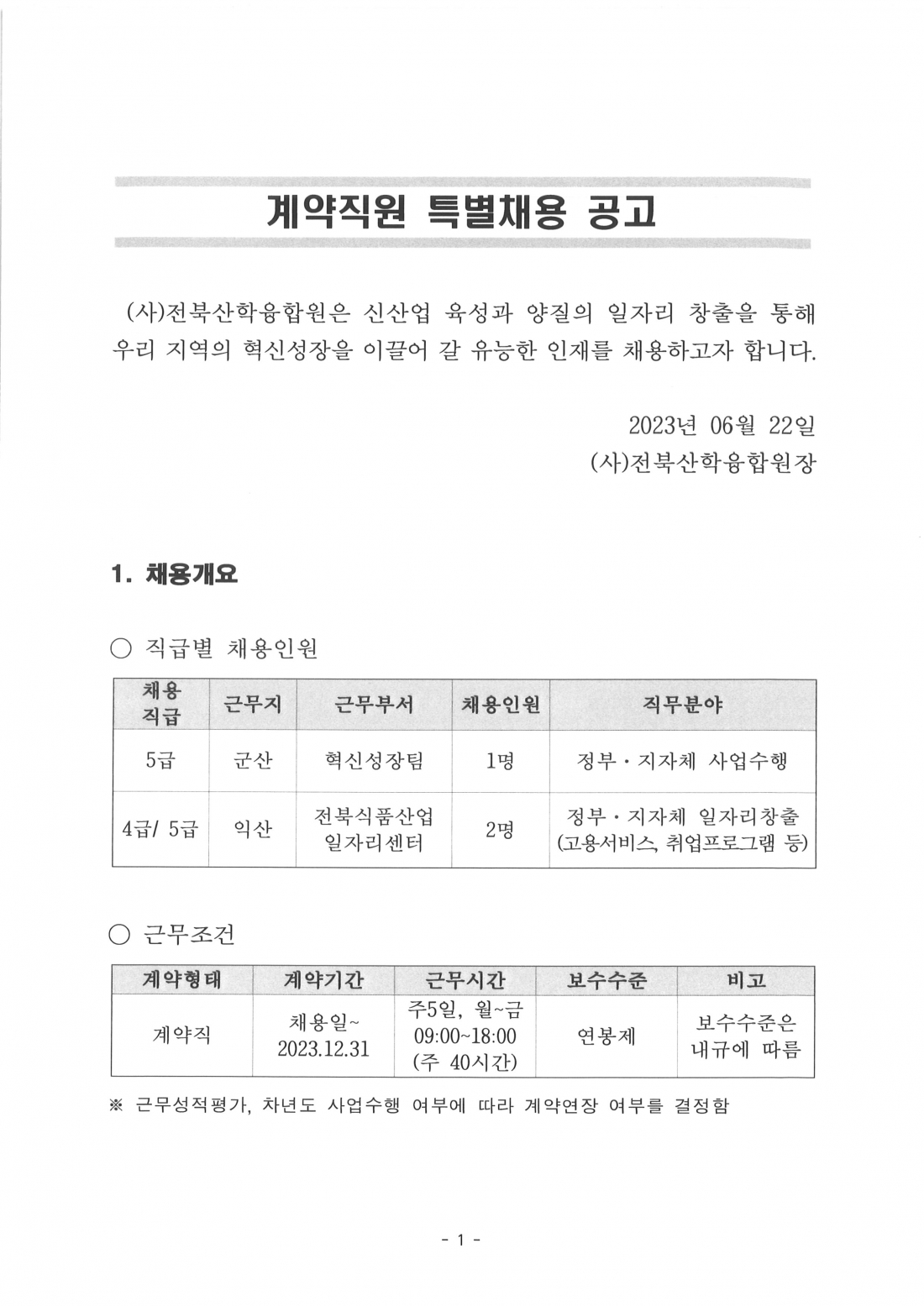 전북산학융합원 계약직원 특별채용 공고(접수종료)